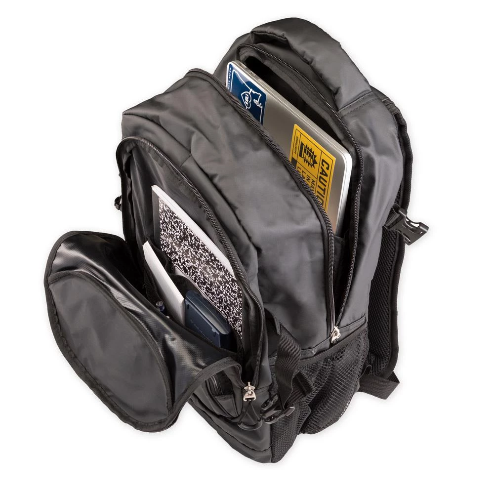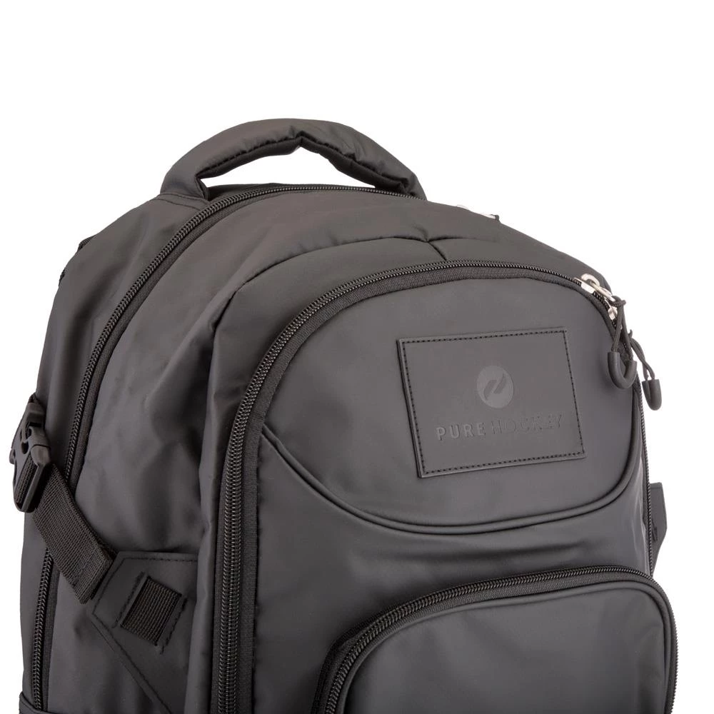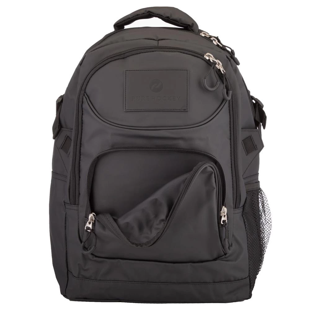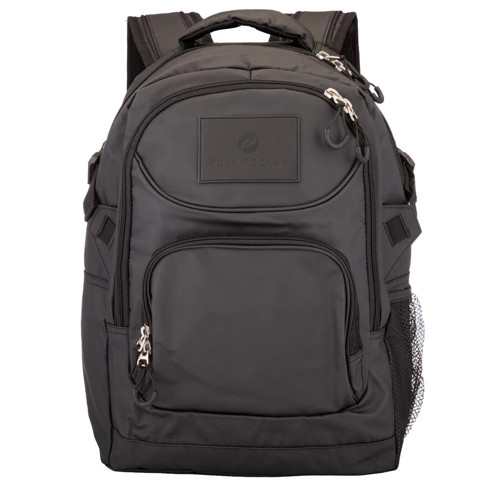 This Pure Hockey Pro Backpack will be great for school and those long hockey road trips. It has a hockey bag feel to it and a black Pure Hockey patch on the front for a slick stylish look. Other features include a small front zipper pocket, a larger middle zipped area with inside pockets, and a large main area with a laptop sleeve. This backpack also includes a side mesh pocket for your water bottle making it fully equipped to handle everything you will need for your day!